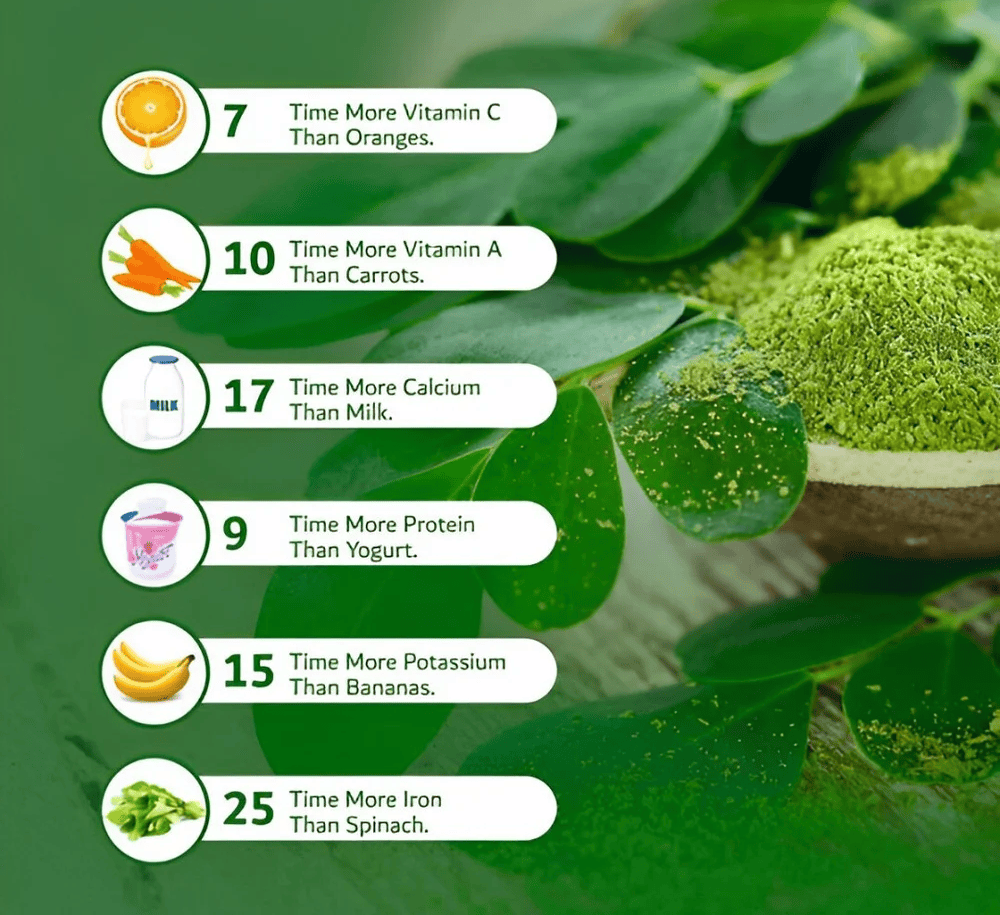 • Moringa leaf contains nearly 100 different nutrients, 46 types of antioxidants, all nine essential amino acids, and is a source of natural protein.